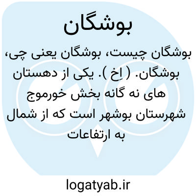 بوشگان. ( اِخ ). یکی از دهستان های نه گانه بخش خورموج شهرستان بوشهر است که از شمال به ارتفاعات بزپر و کوه گیسگان و سرمشهد و از خاور به ارتفاعات والان و خراشیند و از جنوب به کوههای درویش و دار و رئیس غلام و شنبه و از باختر بدهستان حومه خورموج و بخش اهرم محدود میشود. این دهستان در شمال خاوری بخش، واقع شده و رودخانه دشت پلنگ از وسط آن می گذرد. سیزده آبادی، دهستان مزبور را تشکیل میدهد و مجموعاً دارای 600 تن سکنه است و قراء مهم آن عبارتند از: طلعه. فاریاب. کلمه. دهرود علیا و سفلی. تنگ درم. ارغون. مرکز دهستان، قریه بوشگان میباشد. ( از فرهنگ جغرافیائی ایران ج 7 ).