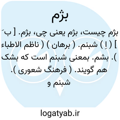 بژم. [ ب َ ] ( اِ ) شبنم. ( برهان ) ( ناظم الاطباء ). بشم. بمعنی شبنم است که بشک هم گویند. ( فرهنگ شعوری ). شبنم و بخار بامداد که روی زمین را بپوشد. گفته اند صحیح نِزْم است بکسر نون و زای تازی که بشک نیز گویند. ( انجمن آرای ناصری ) ( آنندراج ). بَشْک. بشم. صقیع. ( برهان ). و رجوع به بَشْک و بشم شود. بژم. [ ب َ ] ( اِ ) پژم. پژ. رجوع به پژ و پَژْم شود. این کلمه مزید مؤخر امکنه آید مانند: بیرون بژم، میان بژم،کوه بژم، کیوان بژم، کوهستان دوبژم، و مزید مقدم: بژم عباس کوتی و بژم موسی. ( یادداشت بخط مرحوم دهخدا ).