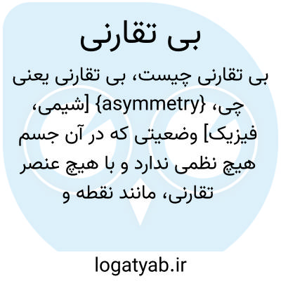 {asymmetry} [شیمی، فیزیک] وضعیتی که در آن جسم هیچ نظمی ندارد و با هیچ عنصر تقارنی، مانند نقطه و محور و صفحه، نمیتوان بخشی از آن را متناظر با بخش دیگری در نظر گرفت
