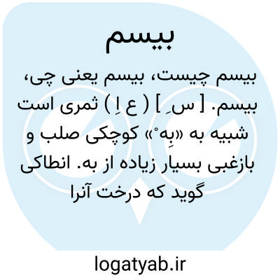 بیسم. [ س ِ ] ( ع اِ ) ثمری است شبیه به «بِه ْ» کوچکی صلب و بازغبی بسیار زیاده از به. انطاکی گوید که درخت آنرا پیوند از سیب و امرود و یا با نهال بلوط و یا بید و یا قسطل که شاه بلوط است مینمایند و کثیرالوجود و بسیار پیوند از تفاح و صفصاف که بید است مینمایند و هنگام رسیدن ثمر آن هنگام رسیدن ثمار دیگر است و تا اواسط زمستان می ماند. ( مخزن الادویه ص 260 ). درختی است که به درخت بلوط ماند و میوه آن مانند میوه به خرد می باشد. ( از ذیل اقرب الموارد ). رجوع به تذکره داود ضریر انطاکی ص 91 شود.