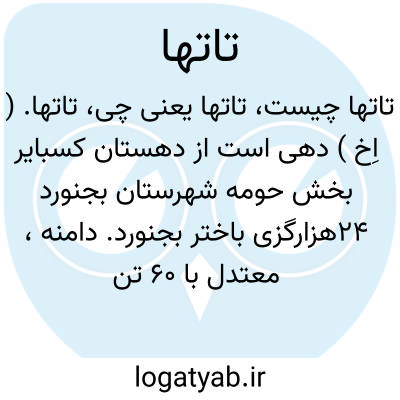 تاتها. ( اِخ ) دهی است از دهستان کسبایر بخش حومه شهرستان بجنورد 24هزارگزی باختر بجنورد. دامنه، معتدل با 60 تن سکنه.زبان کردی، فارسی. آب آن از رودخانه. محصول آنجا غلات، انگور. شغل اهالی زراعت. صنایع دستی قالی بافی. راه آن مالرو است. ( از فرهنگ جغرافیائی ایران ج 9 ).