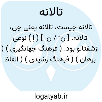 تالانه. [ ن َ / ن ِ ] ( اِ ) نوعی ازشفتالو بود. ( فرهنگ جهانگیری ) ( برهان ) ( فرهنگ رشیدی ) ( الفاظ الادویه ). بعضی گویند: میوه ای است شبیه به شفتالو. ( برهان ) ( شرفنامه منیری ). تالانک. ( آنندراج ) ( انجمن آرا ). میوه ای است از جنس هلو و شفتالو. ( فرهنگ نظام ). میوه ای شبیه به هلو. ( ناظم الاطباء ). نامهای دیگرش شفترنگ و شلیل است. ( فرهنگ نظام ):