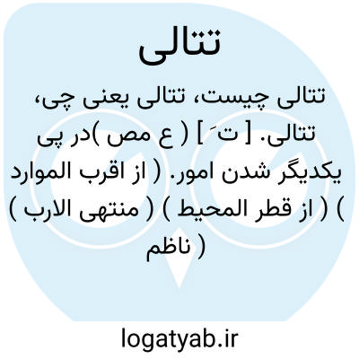 تتالی. [ ت َ ] ( ع مص )در پی یکدیگر شدن امور. ( از اقرب الموارد ) ( از قطر المحیط ) ( منتهی الارب ) ( ناظم الاطباء ). || آمدن سواران پی در پی. ( از ناظم الاطباء ): جأت الخیل تتالیاً؛ ای متتابعة. ( اقرب الموارد ) ( منتهی الارب ).