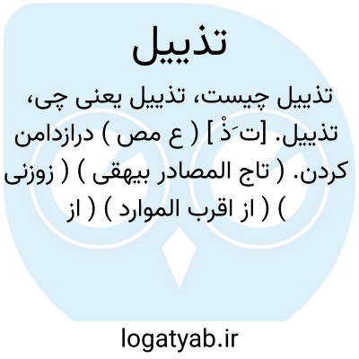 تذییل. [ت َذْ ] ( ع مص ) درازدامن کردن. ( تاج المصادر بیهقی ) ( زوزنی ) ( از اقرب الموارد ) ( از المنجد ). چیزی را دامن چیزی کردن. ( آنندراج ). || نوشتن در ذیل صحیفه علاوه بر آنچه در آن هست. ( از اقرب الموارد ) ( از المنجد ). || ( اِ ) آنچه پس از تمام کردن کتابی در تکمیل یا توضیح آن نویسند. ذیل. ( یادداشت بخط مرحوم دهخدا ). ضمیمه. ( ناظم الاطباء ). || ( مص ) ( اصطلاح معانی ) تعقیب جمله ای است بجمله دیگر که مشتمل باشد بر معنی جمله اولی برای تأکید منطوق یا مفهوم آن، اول چنانکه در آیه شریفه ٔ: و قل جاء الحق و زهق الباطل ان الباطل کان زهوقاً. جمله اخیره بمعنی جمله ماقبلش و تأکید منطوق آن است، چنانکه در بیت ناصرخسرو علوی:
