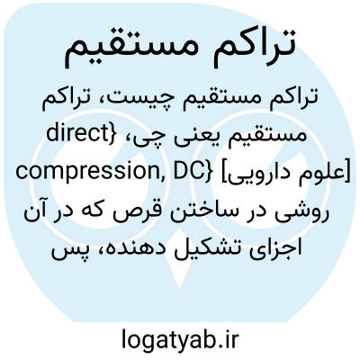 {direct compression, DC} [علوم دارویی] روشی در ساختن قرص که در آن اجزای تشکیل دهنده، پس از اختلاط، با اعمال فشار شکل می گیرند
