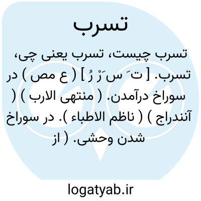 تسرب. [ ت َ س َرْ رُ ] ( ع مص ) در سوراخ درآمدن. ( منتهی الارب ) ( آنندراج ) ( ناظم الاطباء ). در سوراخ شدن وحشی. ( از متن اللغة ) ( از اقرب الموارد ) ( از المنجد ). انسراب ( متن اللغة ) ( اقرب الموارد ). || پر گردیدن آب و شراب. ( از متن اللغة ) ( از اقرب الموارد ) ( از المنجد ).
