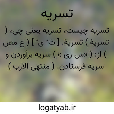 ( تسریة ) تسریة. [ ت َ ی َ ] ( ع مص ) از: ( «س ری » ) سریه برآوردن و سریه فرستادن. ( منتهی الارب ) ( ناظم الاطباء ). || زدودن اندوه را از کسی. ( از متن اللغة ).