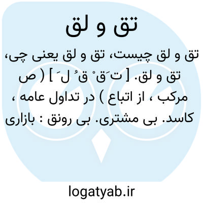تق و لق. [ ت َق ْ ق ُ ل َ ] ( ص مرکب، از اتباع ) در تداول عامه، کاسد. بی مشتری. بی رونق: بازاری تق و لق؛ بازاری کاسد. دکانی تق و لق؛ دکانی بی کالا و مشتری. ( یادداشت بخط مرحوم دهخدا ).
