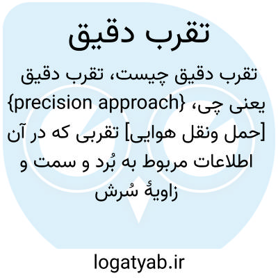 {precision approach} [حمل ونقل هوایی] تقربی که در آن اطلاعات مربوط به بُرد و سمت و زاویۀ سُرش در اختیار خلبان قرار می گیرد