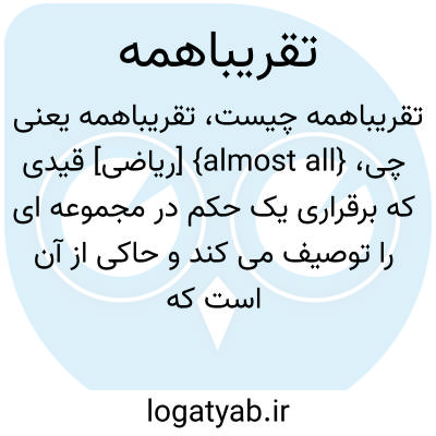 {almost all} [ریاضی] قیدی که برقراری یک حکم در مجموعه ای را توصیف می کند و حاکی از آن است که آن حکم در همۀ نقاط آن مجموعه به جز در مجموعه ای با اندازۀ صفر برقرار است متـ. تقریباًهمه جا almost everywhere, AE