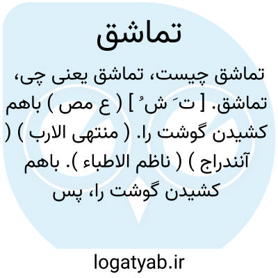 تماشق. [ ت َ ش ُ ] ( ع مص ) باهم کشیدن گوشت را. ( منتهی الارب ) ( آنندراج ) ( ناظم الاطباء ). باهم کشیدن گوشت را، پس خوردن آن را. ( از اقرب الموارد ).