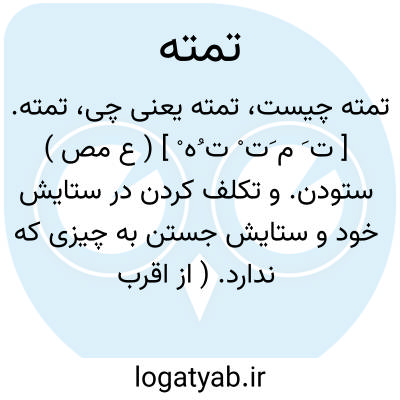 تمته. [ ت َ م َت ْ ت ُه ْ ] ( ع مص ) ستودن. و تکلف کردن در ستایش خود و ستایش جستن به چیزی که ندارد. ( از اقرب الموارد ). و گویند خود را به حیرت و حماقت زدن. ( از اقرب الموارد ). || محنت ورزیدن. || خرامیدن به ناز. ( منتهی الارب ) ( ناظم الاطباء ). || مبالغه کردن در چیزی. ( منتهی الارب ) ( از اقرب الموارد ). مبالغه نمودن در چیزی و گمراه شدن. ( ناظم الاطباء ). || درمان کردن غوایت و باطل. ( از اقرب الموارد ). || ( ع اِ ) راز نهانی. ( منتهی الارب ) ( از ناظم الاطباء ). || غوایت. ( منتهی الارب ). گمراهی و غوایت و خبط و خطا. ( ناظم الاطباء ).