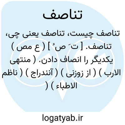 تناصف. [ ت َ ص ُ ] ( ع مص ) یکدیگر را انصاف دادن. ( منتهی الارب ) ( از زوزنی ) ( آنندراج ) ( ناظم الاطباء ) ( از اقرب الموارد ): انی غرضت الی تناصف وجهها؛ یعنی استواءَ المحاسن کان بعض اعضاء الوجه انصف بعضاً فی اخذ القسط من الجمال. ( اقرب الموارد ).