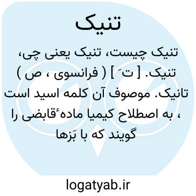 تنیک. [ ت َ ] ( فرانسوی، ص ) تانیک. موصوف آن کلمه اسید است، به اصطلاح کیمیا ماده ٔقابضی را گویند که با بَزها ( بازها ) مرکب شده تولیدتنات کند، و آن را تنن نیز گویند. ( ناظم الاطباء ).