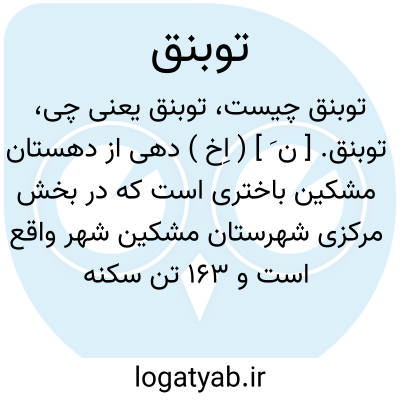 توبنق. [ ن َ ] ( اِخ ) دهی از دهستان مشکین باختری است که در بخش مرکزی شهرستان مشکین شهر واقع است و 163 تن سکنه دارد. ( از فرهنگ جغرافیایی ایران ج 4 ).