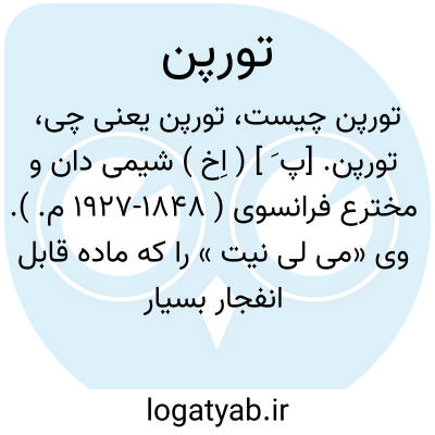 تورپن. [پ َ ] ( اِخ ) شیمی دان و مخترع فرانسوی ( 1848-1927 م. ). وی «می لی نیت » را که ماده قابل انفجار بسیار قوی است کشف کرد. ( از لاروس ).