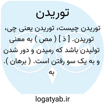 توریدن. [ دَ ] ( مص ) به معنی تولیدن باشد که رمیدن و دور شدن و به یک سو رفتن است. ( برهان ). به معنی رمیدن و دور شدن بود و تولیدن نیز گویند. ( فرهنگ جهانگیری ). تولیدن و گریختن و رمیدن و دور شدن و به یک سو رفتن. ( ناظم الاطباء ). || شرمنده شدن در حضور خصم. ( برهان ). بسیار شرمنده شدن. ( ناظم الاطباء ). شرمنده شدن و شکسته شدن به حضور خصم. ( آنندراج ). || پرسیدن و تفحص کردن و جاسوسی کردن. ( ناظم الاطباء ).