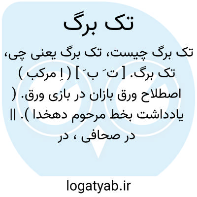 تک برگ. [ ت َ ب َ ] ( اِ مرکب ) اصطلاح ورق بازان در بازی ورق. ( یادداشت بخط مرحوم دهخدا ). || در صحافی، در تداول لت در جزوه و کتاب، و آن ورقی است خارج از صفحات متصل یک فرم چاپی که در اول یا وسط کتاب و جزوه افزایند بخاطر افزایش بر مطالب یا جبران افتادگی مطالب لازم کتاب یا جزوه.