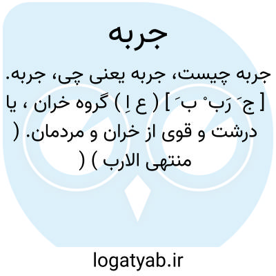 جربه. [ ج َ رَب ْ ب َ ] ( ع اِ ) گروه خران، یا درشت و قوی از خران و مردمان. ( منتهی الارب ) ( آنندراج ) ( ناظم الاطباء ). مردمان قوی در صورتی که گروهی متساوی باشند. ( از اقرب الموارد ). گروه خران درشت و قوی از خران را نیز گفته اند. ( ذیل اقرب الموارد ). || زهار خر. || بسیار. ( منتهی الارب ) ( آنندراج ) ( ناظم الاطباء ). || عیال مرد که بخورند و نفع نبخشند. ( منتهی الارب ) ( آنندراج ) ( ناظم الاطباء ) ( از اقرب الموارد ).