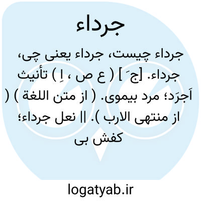 جرداء. [ج َ ] ( ع ص، اِ ) تأنیث اَجرَد؛ مرد بیموی. ( از متن اللغة ) ( از منتهی الارب ). || نعل جرداء؛ کفش بی موی. ( منتهی الارب ) ( ناظم الاطباء ). || خرمای بی برگ. ( مهذب الاسماء ). || سنگ سخت وتابان. ( منتهی الارب ) ( ناظم الاطباء ) ( از متن اللغة ). || ناقه پرخور. ( از متن اللغة ). || زمین گشاد کم گیاه. ( از متن اللغة ). ارض جرداء؛زمین بی نبات. ( منتهی الارب ) ( ناظم الاطباء ). || تمام و آزاد. ( منتهی الارب ). || سال تمام و کامل. ( از متن اللغة ). سنة جرداء؛ یکسال آزاد. یکسال تمام. یکسال کامل. ( از منتهی الارب ). || شراب صاف که درد در آن نباشد. ( از متن اللغة ).خمر جرداء؛ شراب صاف. ( منتهی الارب ) ( ناظم الاطباء ).