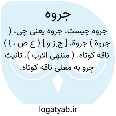 جروة. [ ج ِرْ وَ ] ( اِخ ) نام دو اسب است. ( منتهی الارب ). نام اسب شدادبن معاویه عیسی معروف بفارس جروة است و در حق جروة ( اسب خود ) ابیات زیر را سروده است: