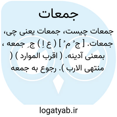 جمعات. [ ج ُ م َ ] ( ع اِ ) ج ِ جمعه، بمعنی آدینه. ( منتهی الارب ) ( اقرب الموارد ). رجوع به جمعه شود.