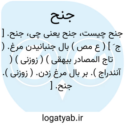 جنح. [ ج ِ ] ( ع اِ ) جانب. ( منتهی الارب ). || ناحیه. ( اقرب الموارد ). کرانه. ( منتهی الارب ). || حمایت و پناه. || پاره: جنح لیل؛ بهره ای از شب. ( منتهی الارب ) ( اقرب الموارد ). پاسی از شب. پاره ای از شب. ( مهذب الاسماء ). و به این معنی گاه مضموم گردد. ( منتهی الارب ) ( اقرب الموارد ).