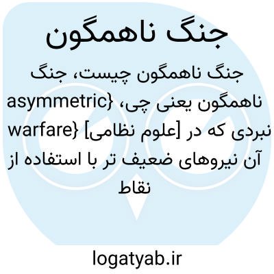 {asymmetric warfare} [علوم نظامی] نبردی که در آن نیروهای ضعیف تر با استفاده از نقاط ضعف دشمن و روش های مبتکرانه به مبارزه با نیروهای قوی تر بپردازند