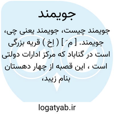 جویمند. [ م َ ] ( اِخ ) قریه بزرگی است در گناباد که مرکز ادارات دولتی است، این قصبه از چهار دهستان بنام زیبد، کاخک، مرکزی و بیدخت تشکیل شده. محصول آن غلات، بنشن، زعفران، ابریشم، زیره، انواع میوه جات. جمع قراء 53 و جمعیت آن در حدود 42945 تن میباشد. رجوع به فرهنگ جغرافیایی ایران ج 9 شود.