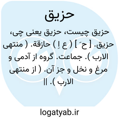 حزیق. [ ح َ ] ( ع اِ ) حازقة. ( منتهی الارب ). جماعت. گروه از آدمی و مرغ و نخل و جز آن. ( از منتهی الارب ). || بانگ یوز. ( مهذب الاسماء ). || ج ِ حزیقة.