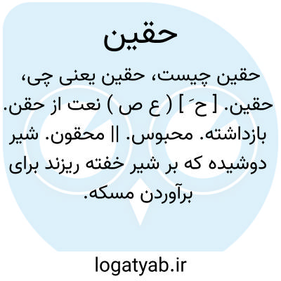 حقین. [ ح َ ] ( ع ص ) نعت از حقن. بازداشته. محبوس. || محقون. شیر دوشیده که بر شیر خفته ریزند برای برآوردن مسکه. و در مثل است: ابی الحقین العذرة، اَی العذر. و آن برای کسی گویند که عذر آرد و عذر او نه درست باشد. ( منتهی الارب ). شیر ماست. ( مهذب الاسماء ).