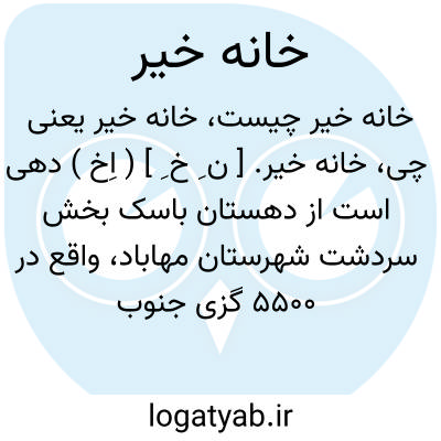 خانه خیر. [ ن ِ خ ِ ] ( اِخ ) دهی است از دهستان باسک بخش سردشت شهرستان مهاباد، واقع در 5500 گزی جنوب خاوری سردشت و چهارهزارگزی جنوب شوسه سردشت به بانه. این ناحیه کوهستانی و دارای جنگل. آب و هوای آن معتدل و سالم می باشد. آنجا 100 تن سکنه دارد که سنی و کرد زبانند. دهکده مزبور از چشمه مشروب میشود و محصولاتش: غلات، توتون، مازوج و کتیرا است و اهالی با کشاورزی و گله داری گذران میکنند. راه آنجا مالرواست. این ده از دو محل، بفاصله 500 گز، بنام خانه خیر بالا و پائین تشکیل شده و خانه خیر پائین دارای 48 تن سکنه است. ( از فرهنگ جغرافیایی ایران ج 4 ص 187 ).