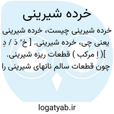 خرده شیرینی. [ خ ُ دَ / دِ ]( اِ مرکب ) قطعات ریزه شیرینی. چون قطعات سالم نانهای شیرینی را از محلی بمحل دیگر نقل کنند آنچه از قطعات شکسته شیرینی باقی ماند بنام خرده شیرینی است.