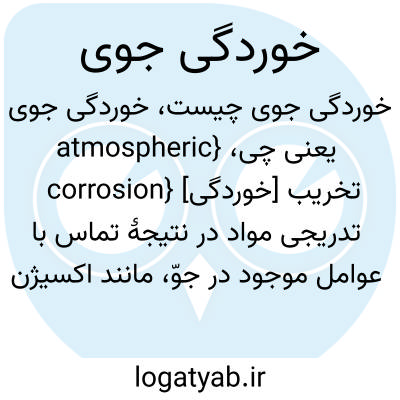 {atmospheric corrosion} [خوردگی] تخریب تدریجی مواد در نتیجۀ تماس با عوامل موجود در جوّ، مانند اکسیژن و کربن دی اکسید و بخار آب و ترکیبات گوگرد و کلر