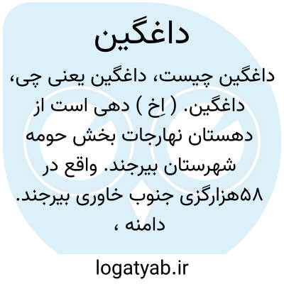 داغگین. ( اِخ ) دهی است از دهستان نهارجات بخش حومه شهرستان بیرجند. واقع در 58هزارگزی جنوب خاوری بیرجند. دامنه، گرمسیر و دارای 40 تن سکنه است. آب آن از چشمه است و محصول آن غلات، شغل اهالی زراعت و راه آن مالرو است. ( از فرهنگ جغرافیایی ایران ج 9 ).