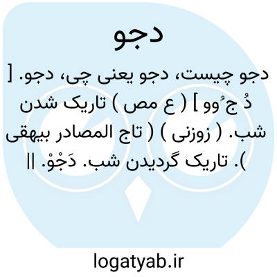 دجو. [ دُ ج ُوو ] ( ع مص ) تاریک شدن شب. ( زوزنی ) ( تاج المصادر بیهقی ). تاریک گردیدن شب. دَجْوْ. || فروپوشیدن بعض موی بز بعض را و واخیده نشدن. || آرمیدن با زن. || تمام و فراخ گردیدن جامه. || قوی گردیدن اسلام و فروپوشیدن هر چیز را. ( منتهی الارب ).