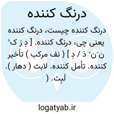 درنگ کننده. [ دِ رَ ک ُ ن َن ْ دَ / دِ ] ( نف مرکب ) تأخیر کننده. تأمل کننده. لابث ( دهار ). لَبِث. ( منتهی الارب ). معوِّق. ( منتهی الارب ). رجوع به درنگ کردن در تمام معانی شود.