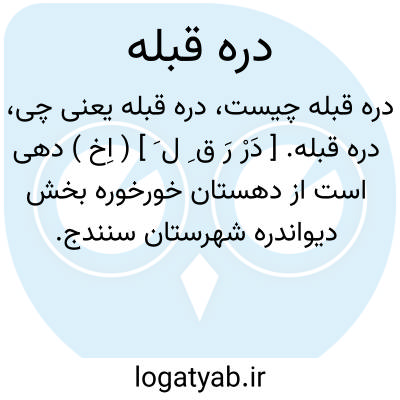 دره قبله. [ دَرْ رَ ق ِ ل َ ] ( اِخ ) دهی است از دهستان خورخوره بخش دیواندره شهرستان سنندج. واقع در 59هزارگزی شمال باختری دیواندره و 12هزارگزی جنوب راه شوسه دیواندره به سقز با 200تن سکنه. آب آن از چشمه و راه آن مالرو است. ( از فرهنگ جغرافیایی ایران ج 5 ).
