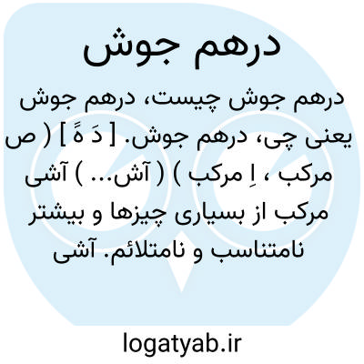 درهم جوش. [ دَ هََ ] ( ص مرکب، اِ مرکب ) ( آش... ) آشی مرکب از بسیاری چیزها و بیشتر نامتناسب و نامتلائم. آشی که حبوب و بقول گوناگون در وی کرده باشند. || مخلوطی از چیزهای نامتناسب با یکدیگر. مخلوطی از بسیار چیز نامتناسب. ( یادداشت مرحوم دهخدا ). و رجوع به این ترکیب ذیل آش شود.