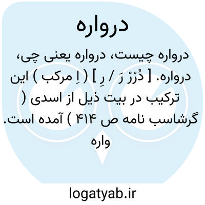 درواره. [ دُرْرْ رَ / رِ ] ( اِ مرکب ) این ترکیب در بیت ذیل از اسدی ( گرشاسب نامه ص 414 ) آمده است. واره معنی نوبت و مانند و بسیار و فصل دارد اما معنی ترکیب روشن نیست: