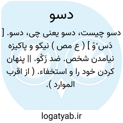 دسو. [ دَس ْوْ ] ( ع مص ) نیکو و پاکیزه نیامدن شخص. ضد زَکْو. || پنهان کردن خود را و استخفاء. ( از اقرب الموارد ). پنهان کردن. ( تاج المصادر بیهقی ). دسوة. و رجوع به دسوة شود.