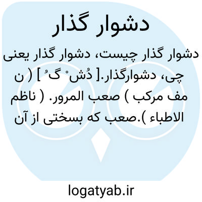 دشوارگذار.[ دُش ْ گ ُ ] ( ن مف مرکب ) صعب المرور. ( ناظم الاطباء ).صعب که بسختی از آن توان گذشتن. صعب السلوک. که گذشتن از آن صعب باشد. مقابل آسان گذار. ( یادداشت مرحوم دهخدا ): أیهم؛ کوه بلند دشوارگذار. بَعکَنة؛ ریگی دشوار گذار. بوباة؛ بیابان و عقبه ای است دشوار گذار در راه یمن. صَعود، صَعوداء؛ عقبه دشوار گذار. ضَمز؛جای درشت و پشته دشوار گذار. عراقیب؛ راههای تنگ ودشوار گذار در پشت کوه. عُنوت؛ پشته دشوارگذار. لَخمة؛ جای دشوار گذار از زمین درشت. مَدرة؛ جایی است تنگ و دشوار گذار مر بنی شعبه را. ( از منتهی الارب ).