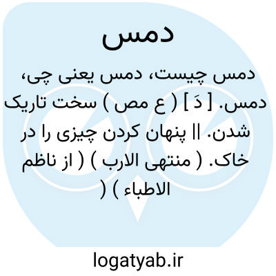 دمس. [ دَ م َ ] ( ع ص ) چیز پنهان کرده شده. ( منتهی الارب ) ( آنندراج ) ( ناظم الاطباء ) ( از نشوءاللغه ص 22 ).