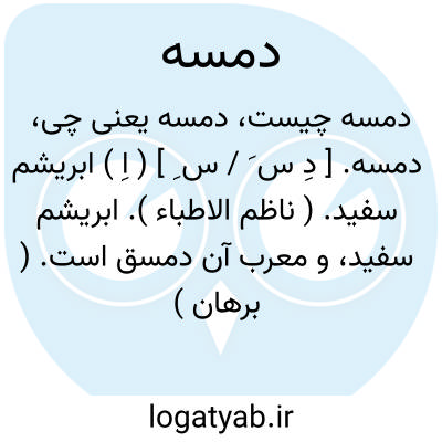 دمسه. [ دِ س َ / س ِ ] ( اِ ) ابریشم سفید. ( ناظم الاطباء ). ابریشم سفید، و معرب آن دمسق است. ( برهان ) ( از آنندراج ) ( از فرهنگ جهانگیری ).