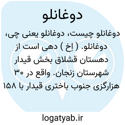 دوغانلو. ( اِخ ) دهی است از دهستان قشلاق بخش قیدار شهرستان زنجان. واقع در 30 هزارگزی جنوب باختری قیدار با 158 تن سکنه. آب آن از چشمه وراه آن مالروست. ( از فرهنگ جغرافیایی ایران ج 2 ).