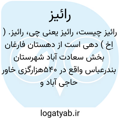 رائیز. ( اِخ ) دهی است از دهستان فارغان بخش سعادت آباد شهرستان بندرعباس واقع در 540هزارگزی خاور حاجی آباد و پنج هزارگزی جنوب راه مالرو حاجی آباد، فارغان. محلی است جلگه، گرمسیر و سکنه آن 277 تن است. آب آن از رودخانه و محصول آن خرما و شغل اهالی زراعت و راه ده مالرو است. ( از فرهنگ جغرافیایی ایران ج 8 ).