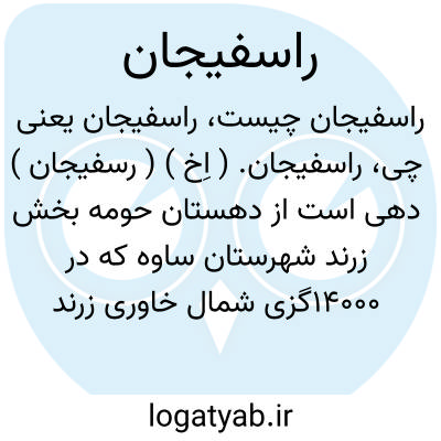 راسفیجان. ( اِخ ) ( رسفیجان ) دهی است از دهستان حومه بخش زرند شهرستان ساوه که در 14000گزی شمال خاوری زرند سر راه زرند به تهران واقع است. محلی است جلگه، معتدل، و آب آن از رودخانه لب شور تأمین میشود. سکنه آن 87 تن و محصول آن غلات، پنبه، چغندرقند، شاه دانه، کرچک است و دارای باغستانهای بادام میباشد. شغل اهالی زراعت، گله داری، گلیم و جاجیم بافی است. راه فرعی دارد. ( از فرهنگ جغرافیایی ایران ج 1 ).