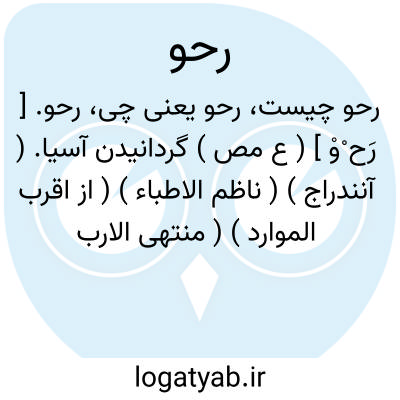 رحو. [ رَح ْوْ ] ( ع مص ) گردانیدن آسیا. ( آنندراج ) ( ناظم الاطباء ) ( از اقرب الموارد ) ( منتهی الارب ). || گرد شدن. ( آنندراج ) ( تاج المصادر بیهقی ) ( از اقرب الموارد ) ( ناظم الاطباء ) ( منتهی الارب ).