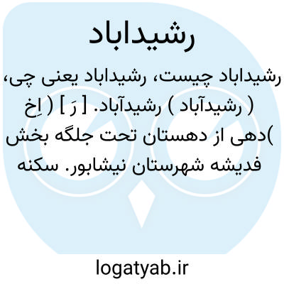 ( رشیدآباد ) رشیدآباد. [ رَ ] ( اِخ )دهی از دهستان تحت جلگه بخش فدیشه شهرستان نیشابور. سکنه 364 تن. آب آن از قنات. محصول آنجا غلات. صنایع دستی کرباس بافی. ( از فرهنگ جغرافیایی ایران ج 9 ).
