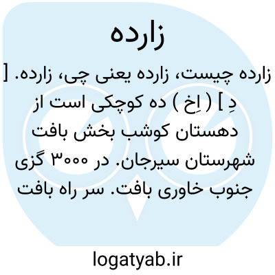 زارده. [ دِ ] ( اِخ ) ده کوچکی است از دهستان کوشب بخش بافت شهرستان سیرجان. در 3000 گزی جنوب خاوری بافت. سر راه بافت به صوغان... ( از فرهنگ جغرافیائی ایران ج 8 ).